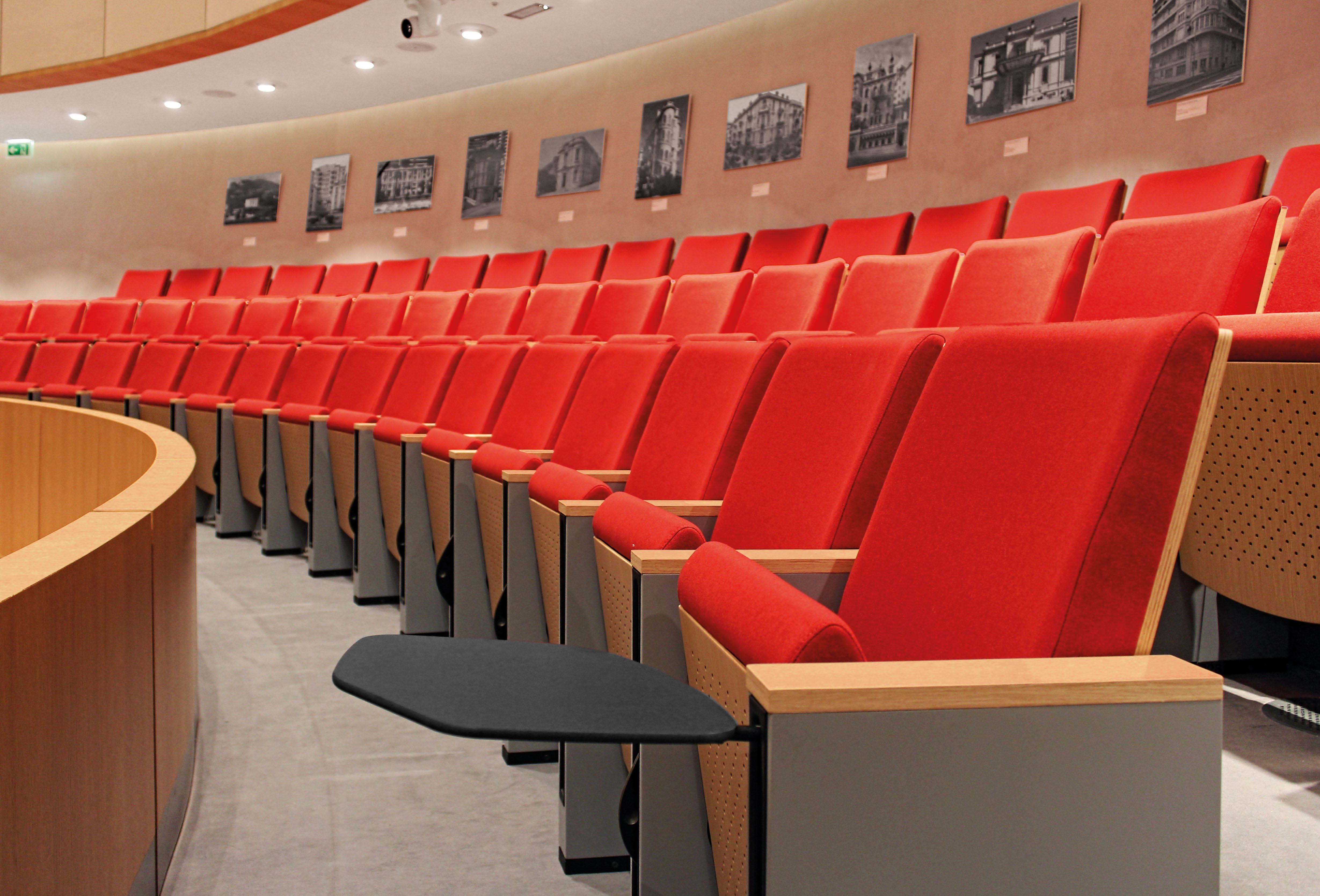Tablets turn a chair into a genuine work station. Each writing tablet features an efficient folding mechanism that guarantees a flush fit along the side of the chair, ensuring plenty of room to move about between rows of seats.