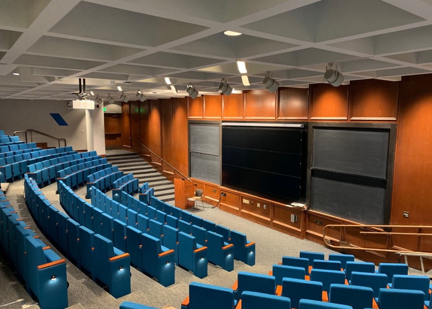 The perfect solution for confined spaces: the V9.9 chair from the V9 Family for the California institute's auditorium. Each chair is equipped with a writing tablet and electrical wiring with a power socket. The light incorporated in the end side panels allowed the interior structures to be adapted to accommodate the application.
