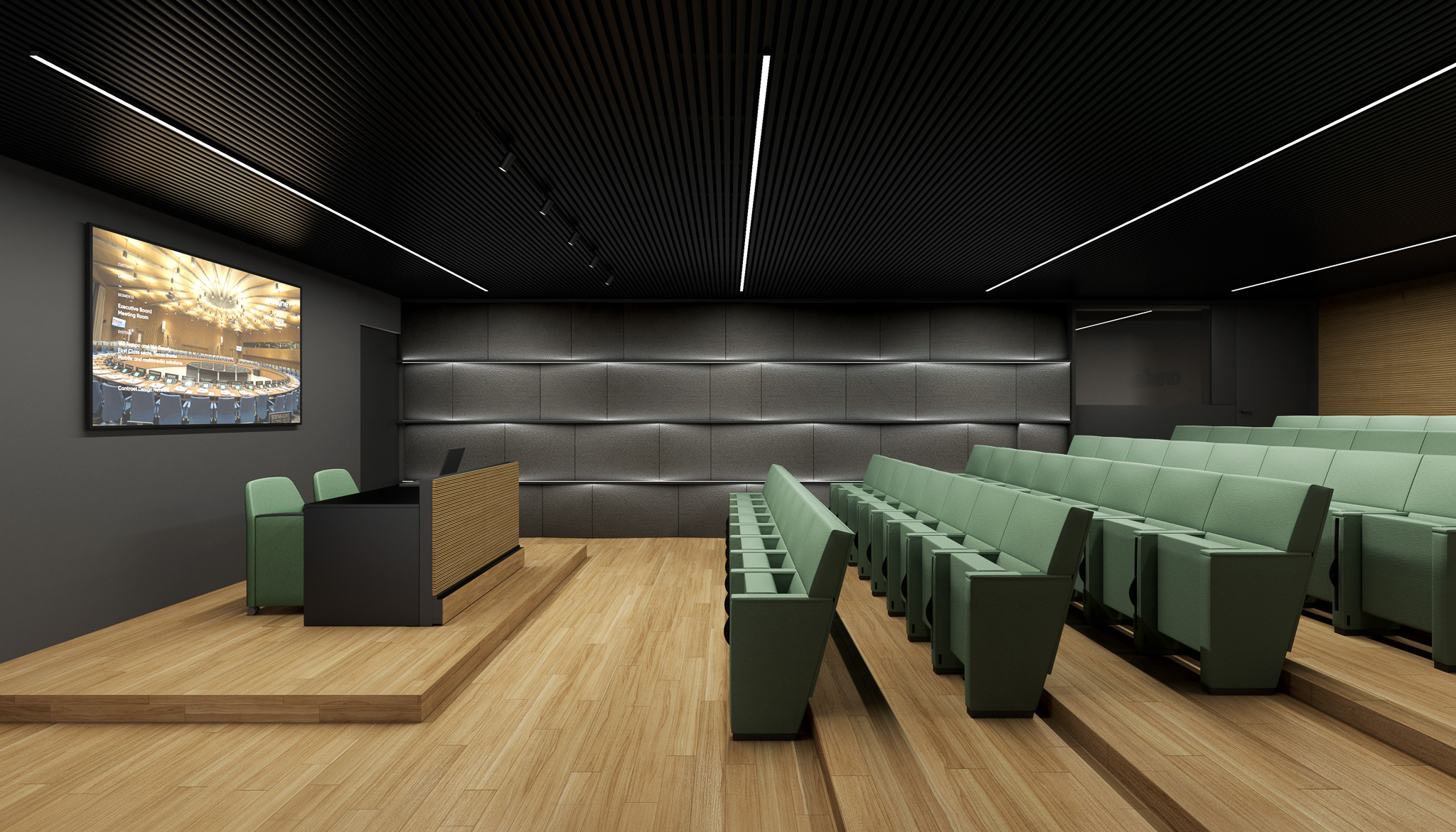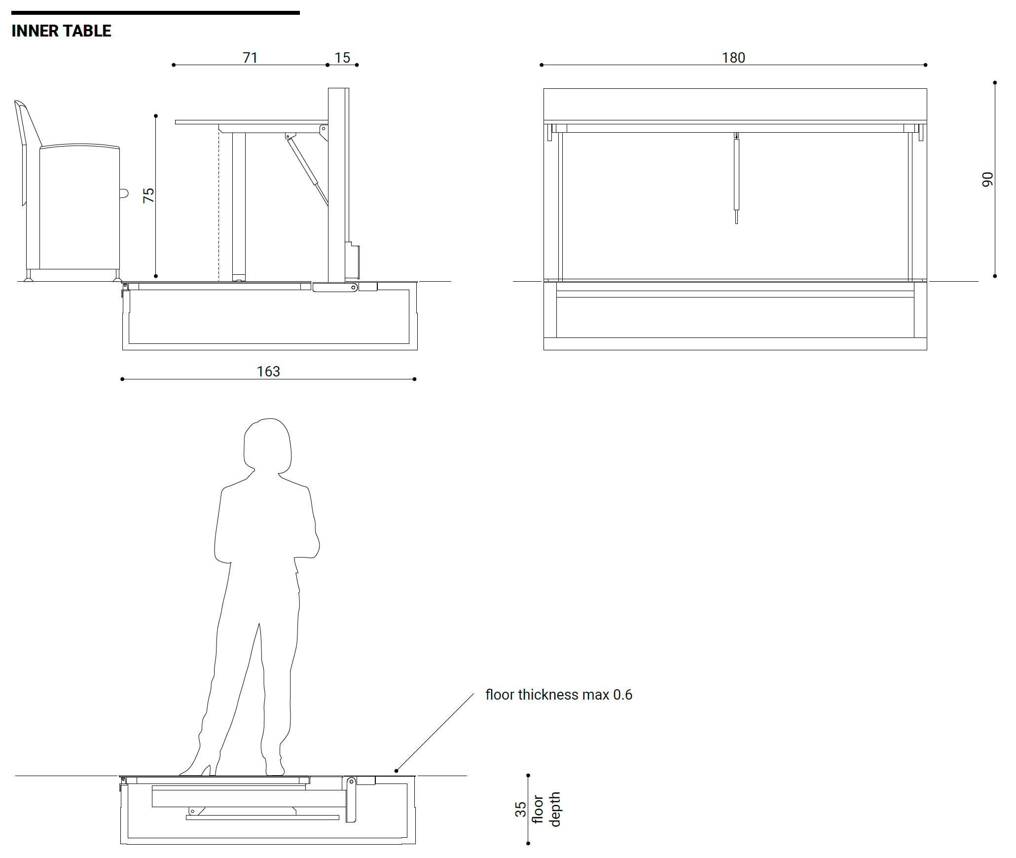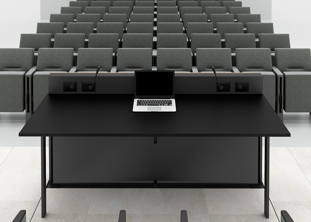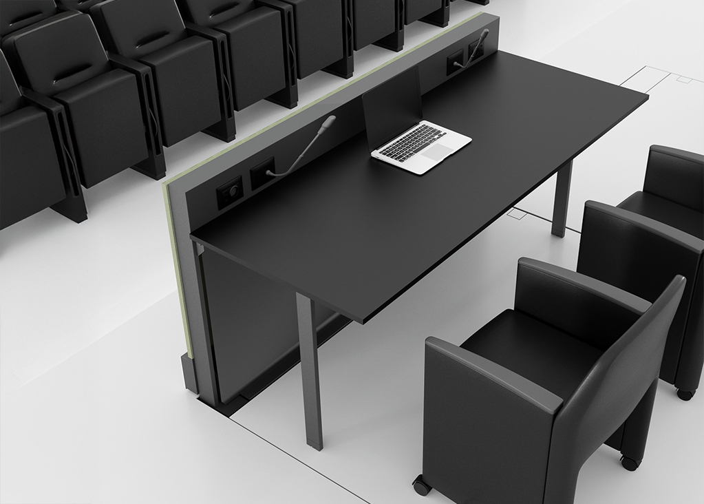 Inner Table est un système modulaire de pupitres pour deux personnes encastré dans le sol, conçue pour accueillir des équipements électroniques audiovisuels ainsi que leurs câblages.