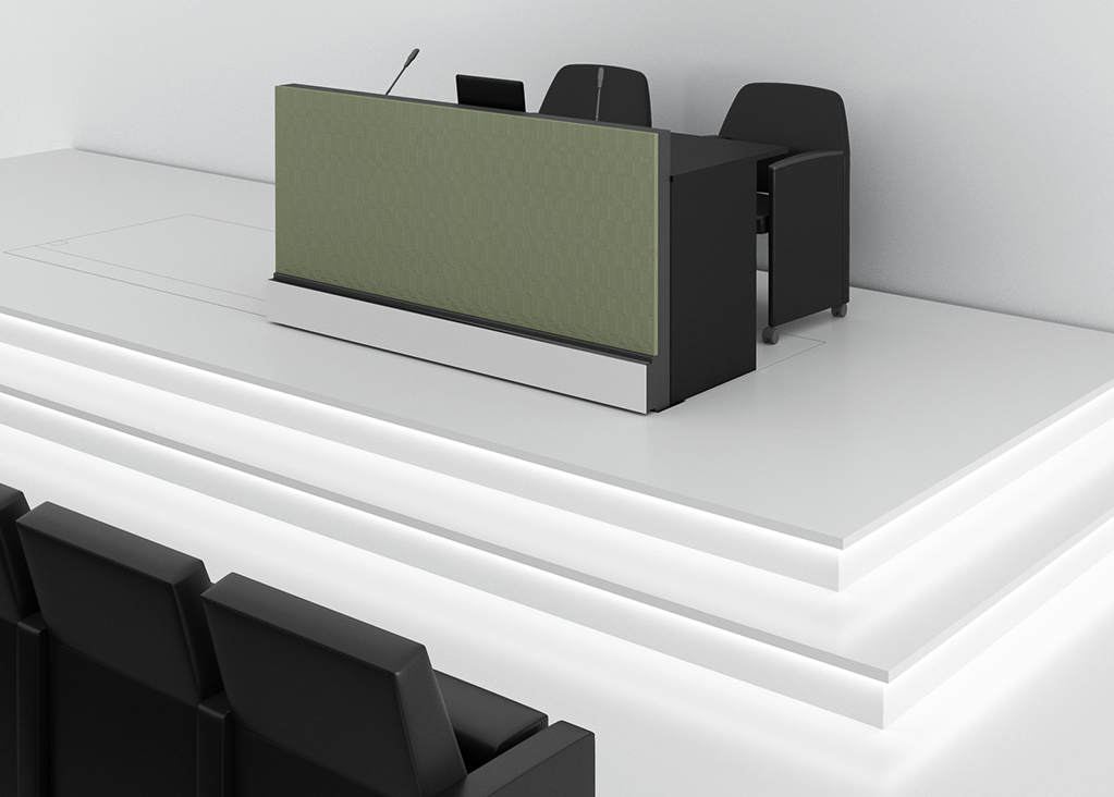 C'est la solution idéale pour des salles polyvalentes avec scène ou des postes de conférenciers, se repliant à seulement 35 cm de hauteur.