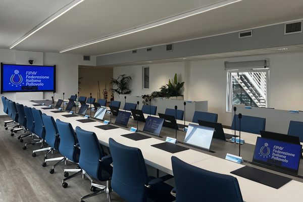 9. Design e tecnologia discreta per la sala conferenze della Federazione Italiana Pallavolo, Roma. (Photo Credits: FIPAV) 10. Sala polifunzionale della sede centrale di SOL Polifunzionale, Roma.