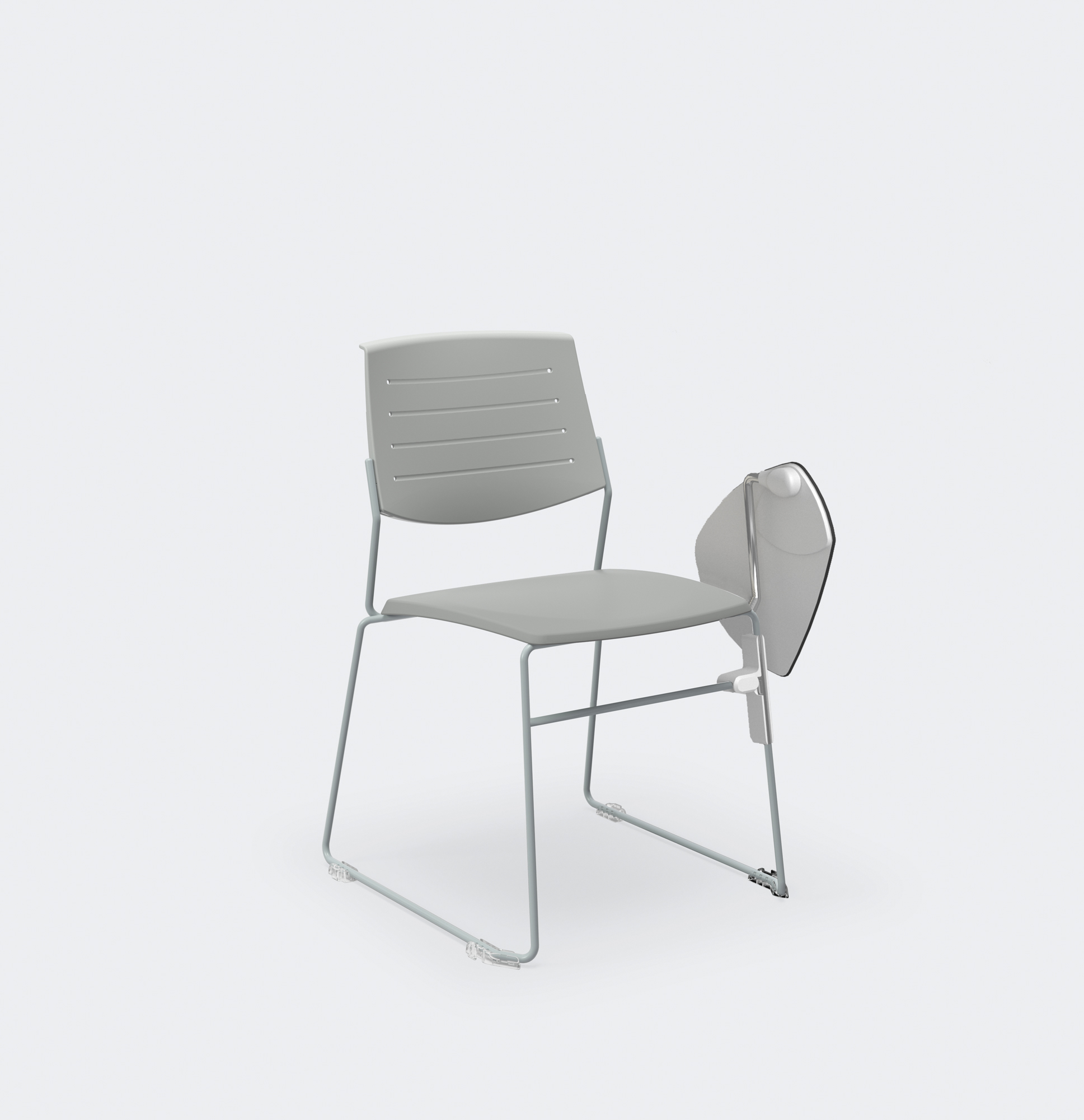Le sedute sono agganciabili tra di loro grazie al piedino ad incastro sul telaio; la tavoletta removibile permette anche di impilarle verticalmente.