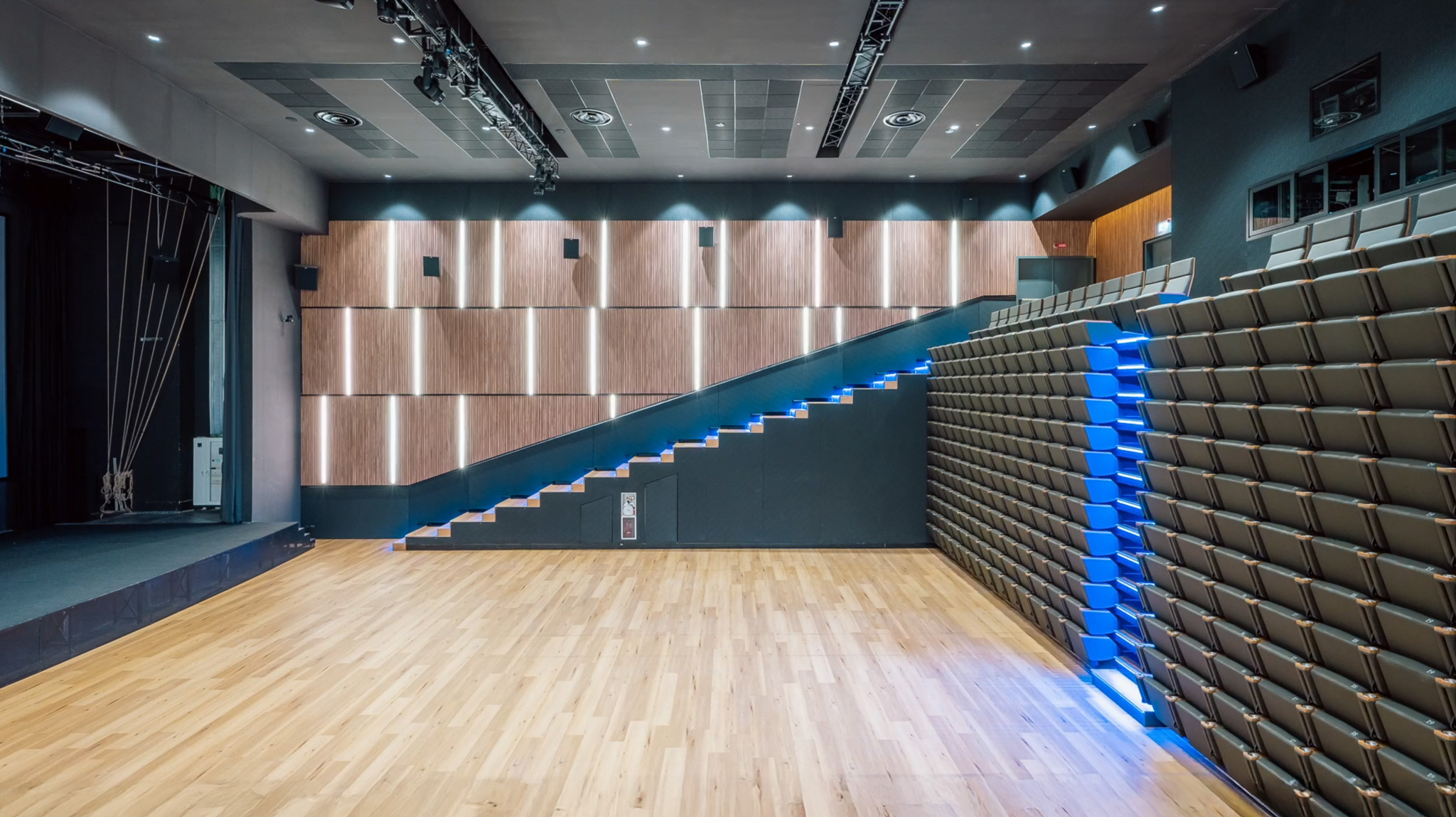 Ogni seduta presenta uno schienale abbattibile all’indietro, soluzione che consente – una volta richiusa la tribuna – di compattare l’intero sistema e restituire allo spazio una superficie libera e riconfigurabile. Ogni fianco è dotato di una tavoletta, un portabicchieri su misura e una presa elettrica posta sul retro.