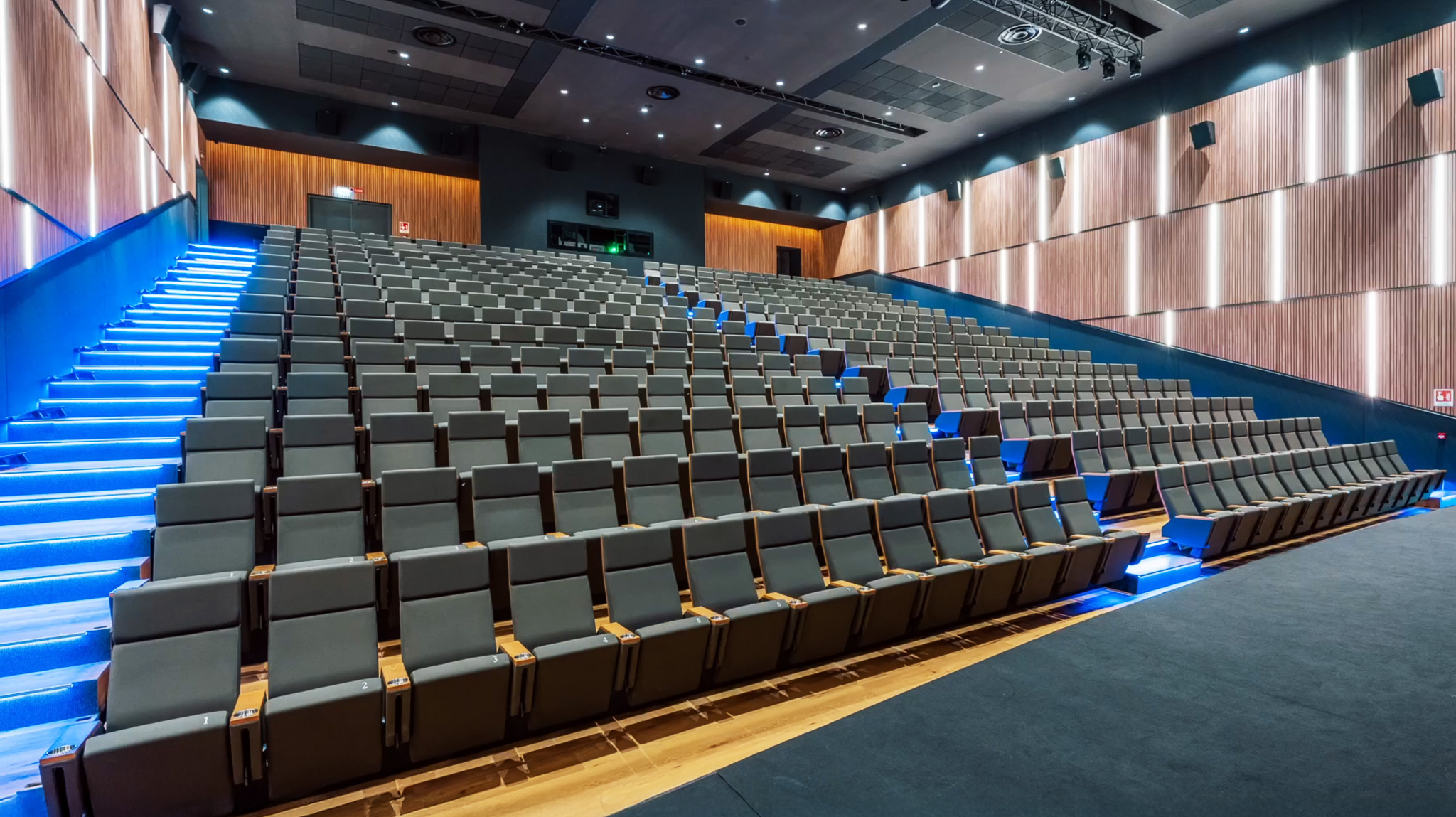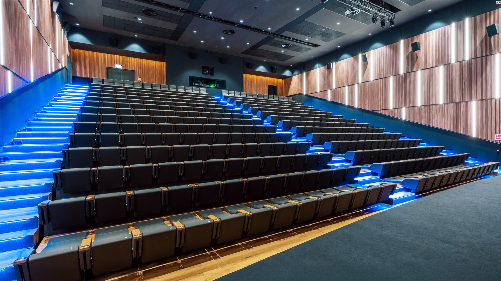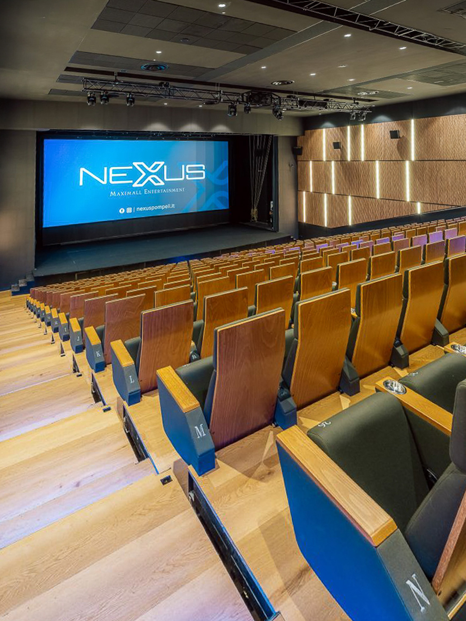 All’interno del nuovo polo attrattivo MaxiMall Pompeii, Aresline si è occupata di fornire la più ampia tra le sette sale del complesso, un ambiente concepito per garantire la massima versatilità d’uso e comfort per lo spettatore. La sala è dotata di una tribuna telescopica completamente motorizzata, sulla quale sono installate poltrone speciali, realizzate su misura secondo le specifiche del committente.
